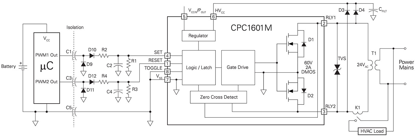 Although the basic CPC1601M circuits shown so far do not include galvanic isolation, galvanic isolation is sometimes required to ensure proper system operation, such as in dual-transformer HVAC systems where the transformer returns are separate and isolated from each other. There are many ways to implement isolation, each with its own tradeoffs.