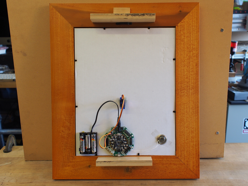 The key to the painting's interactivity will be sound sensing. When you scream, the microphone built into the Circuit Playground Express will detect it and then instruct a wave file we load on the board to play over the amp and speaker, as well as run the servo back and forth.