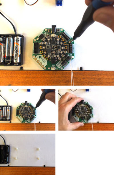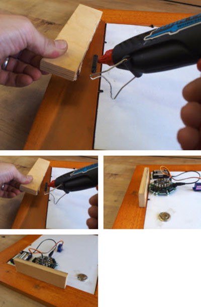 - Use hot glue to affix the battery pack in place next to the Crickit so it can plug into the power jack