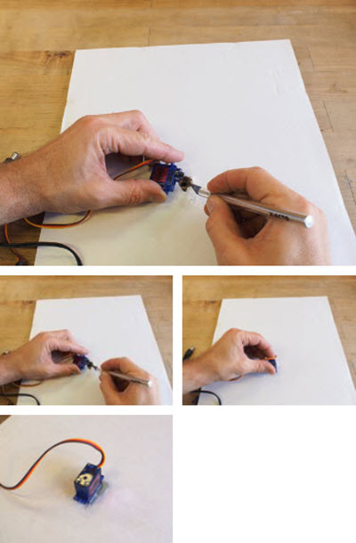- Increase the size of the hole a bit so the servo's keyed circular portion fits. The flat housing will lie flush with the cardboard