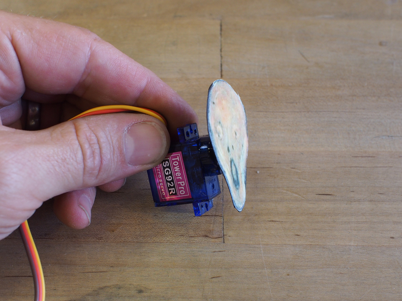 - Center the head and servo horn over the background head, then press down a bit to make an impression -- you'll use this mark as a guide for cutting out a hole to allow the horn to fit. The servo will be on the other side of the cardboard