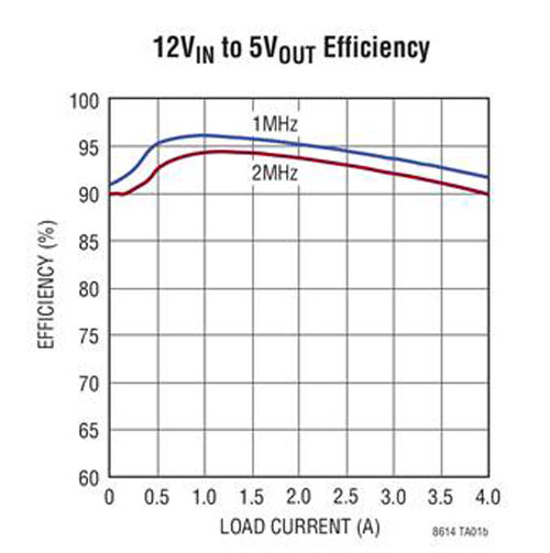 Die internen hocheffizienten Schalter des LT8614 können einen kontinuierlichen Ausgangsstrom von bis zu 4 A bei Spannungen bis hinab zu 0,97 V liefern. Der Burst Mode®-Betrieb bietet einen ultraniedrigen Ruhestrom, sodass er gut für Anwendungen, wie beispielsweise immer eingeschaltete Systeme in der Automobiltechnik, geeignet ist, die die Lebensdauer der Batterie verlängern müssen. Das einzigartige Design des LT8614 hält eine minimale Dropout-Spannung von lediglich 200 mV bei 1 A unter allen Bedingungen, sodass der Baustein sich auch bei Szenarien, wie z. B. dem Kaltstart von Autos, hervortut. Eine kurze Mindesteinschaltzeit von nur 30 ns ermöglicht außerdem 2 MHz-Konstantfrequenzschalten von einem 16-V-Eingang zu einem 1-V-Ausgang und erlaubt somit Entwicklern, die Effizienz zu optimieren, während kritische rauschempfindliche Frequenzbänder vermieden werden können. Das 20-polige QFN-Gehäuse des LT8614 mit 3 mm x 4 mm und eine hohe Schaltfrequenz ermöglichen eine geringe Größe von externen Induktivitäten und Kondensatoren, wobei eine kompakte, thermisch effiziente Grundfläche ermöglicht wird.
