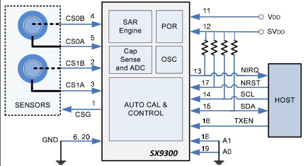 Der SX9300 von Semtech ist der weltweit erste kapazitive Zweikanalregler zur Regelung der spezifischen Absorptionsrate (SAR), der exakt zwischen einem unbelebten Objekt und der Annäherung eines menschlichen Körpers unterscheiden kann. Die resultierende Erfassung wird in tragbaren elektronischen Geräten verwendet, um die Hochfrequenz-(HF)-Sendeleistung bei Anwesenheit eines menschlichen Körpers zu reduzieren und zu regeln. Dadurch ergeben sich für Hersteller von Elektronikgeräten mit elektromagnetischen Strahlungsquellen signifikante Leistungsvorteile bei der Einhaltung der Emissionsrichtlinien und Normen zur spezifischen Absorptionsrate (SAR). Bei direktem Betrieb aus einer Eingangsspannung von 2,7 V bis 5,5 V gibt der SX9300 seine Daten über einen host-kompatiblen seriellen I2C-Bus mit 1,65 V bis 5,5 V aus.