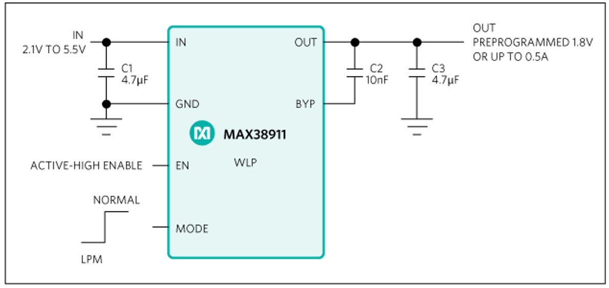 The MAX38911 is available in WLP and TDFN packages and is default factory preprogrammed to an output voltage of 1.8 V.