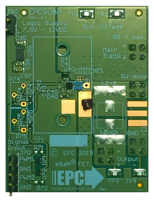 The EPC9068 development board is a 100 V maximum device voltage, 2.7 A maximum output current, half bridge with onboard gate drives,featuring the EPC8010 enhancement mode (eGaN®) field effect transistor (FET). The gate driver has been configured with a synchronous FET bootstrap circuit featuring the EPC2038 eGaN FET that eliminates high side device losses induced by the reverse recovery losses of the internal bootstrap diode of the gate driver.