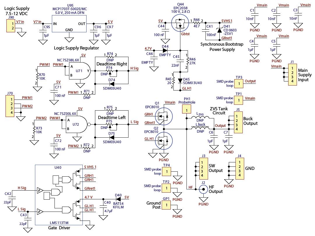 The EPC9068 development board is 2” x 1.5” and has two EPC8010 eGaNFETs in a half bridge configuration using Texas Instruments LM5113 gate driver with supply and bypass capacitors. The board contains all critical components and layout for optimal switching performance. There are also various probe points to facilitate simple waveform measurement and efficiency calculation. The board includes pads for the inclusion of customer components to facilitate testing in a Buck converter or ZVS class-D amplifier configurations. A complete block diagram of the circuit is given in figure 1.